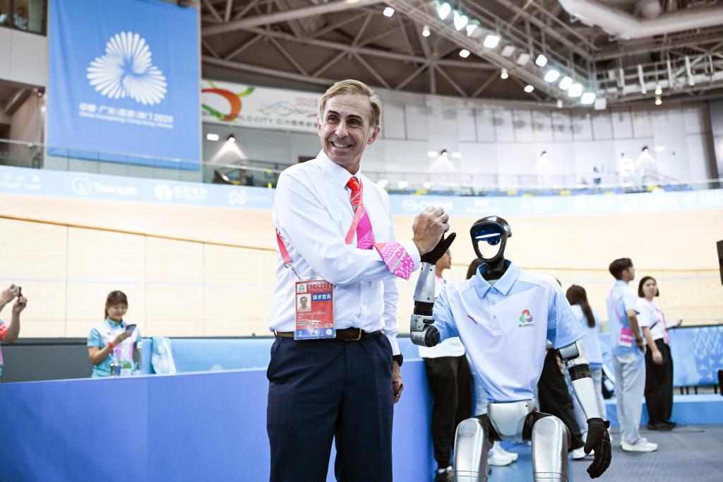 11月13日,一名赛事技能官员在场所自行车女子集体竞速赛决赛前同参加扮演的机器人击掌合影。