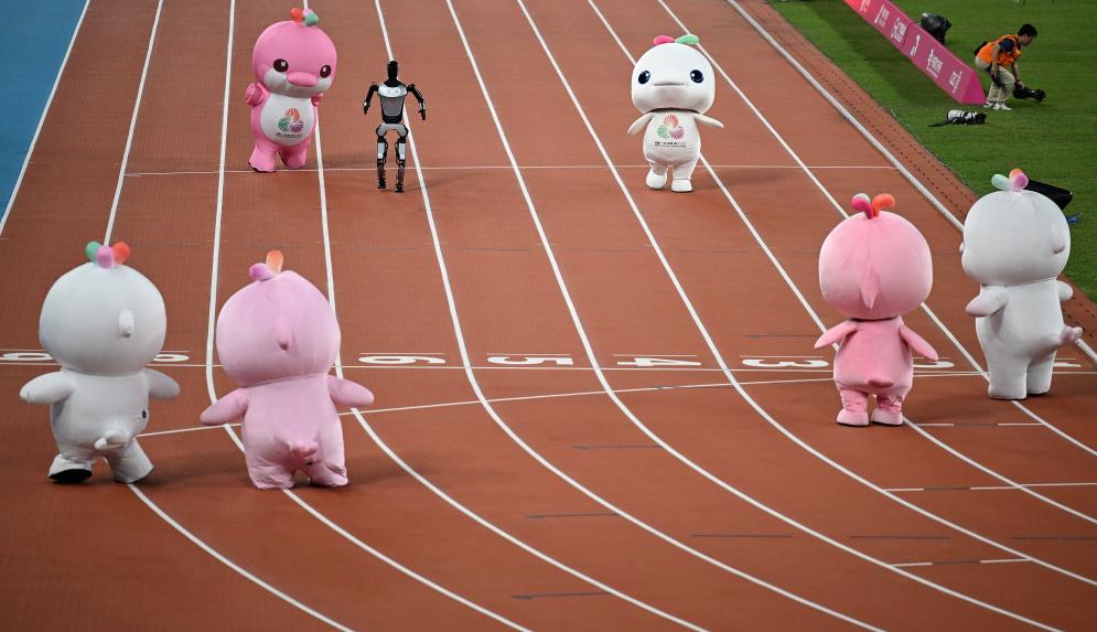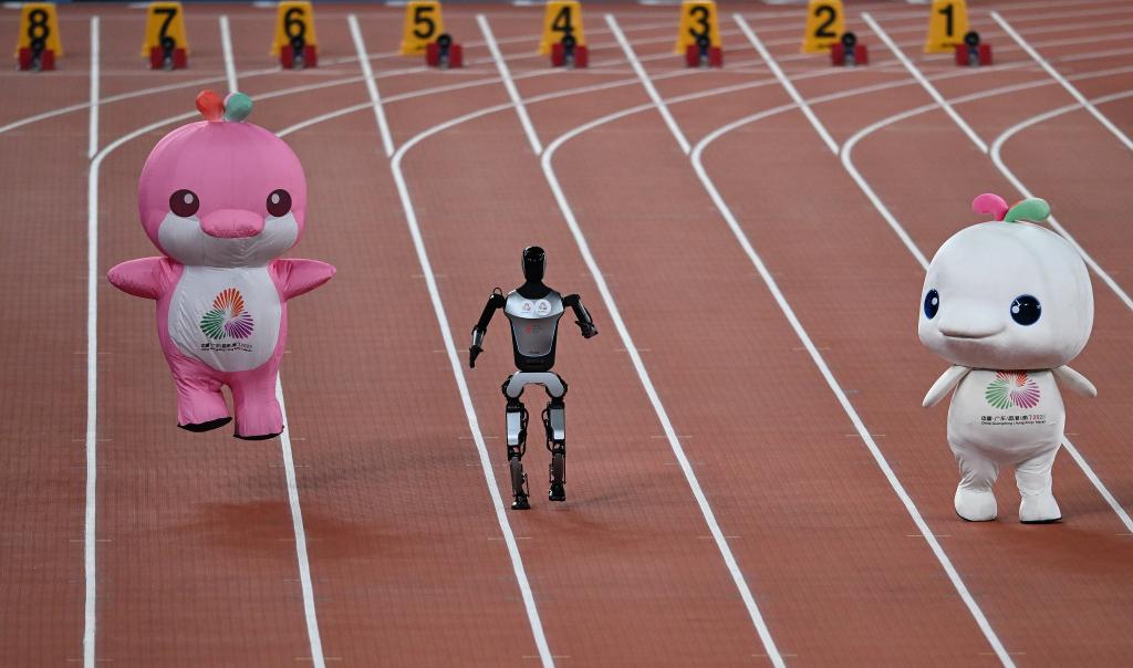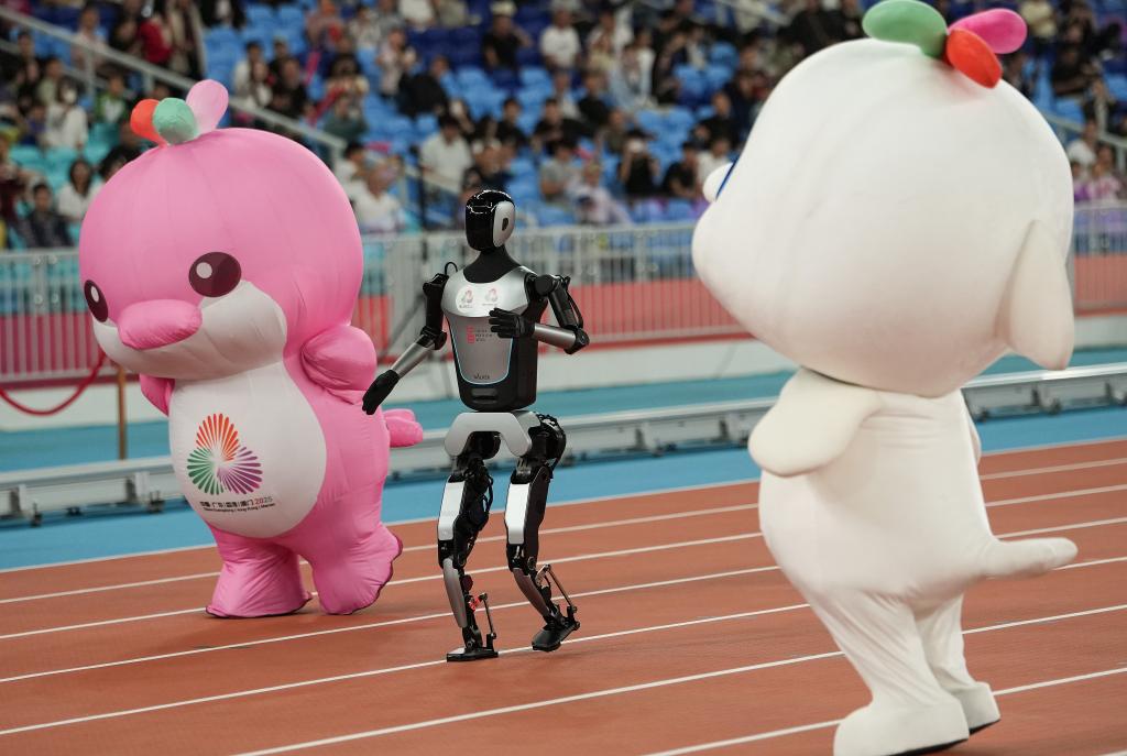 11月17日,在田径项目赛事开端前的暖场活动中,机器人和吉祥物喜洋洋、乐融融在广东奥体中心体育场赛跑。