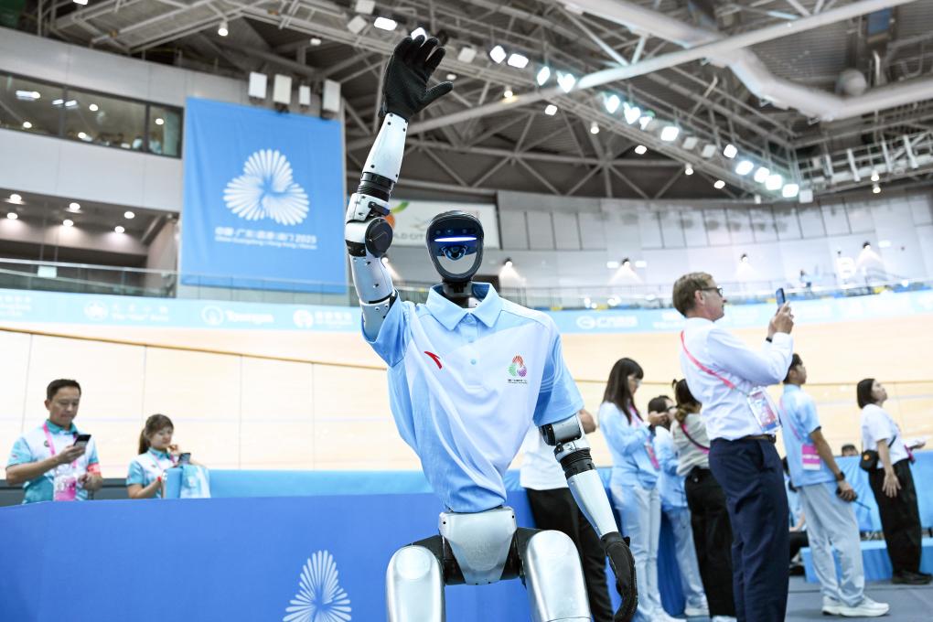 11月13日,参加场所自行车女子集体竞速赛决赛赛前扮演的机器人向现场观众招手互动。